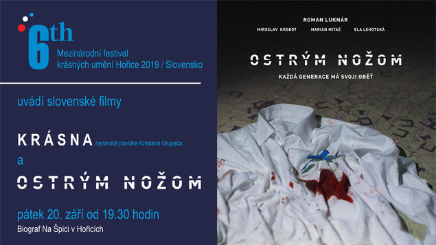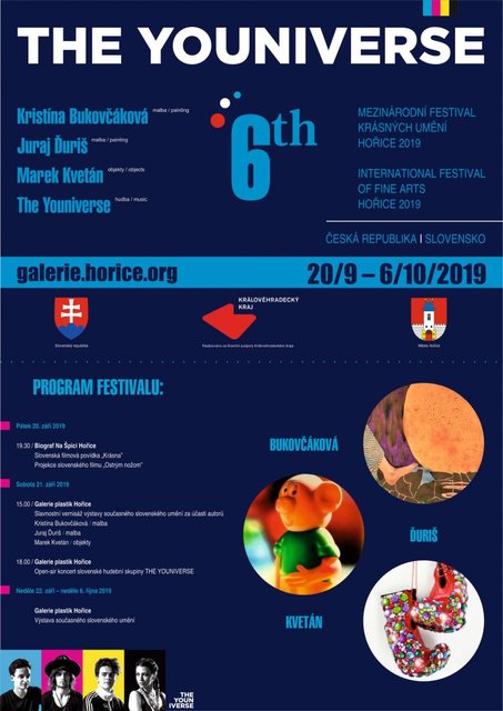Mezinárodní festival krásných umění v režiii hořické Galerie plastik letos nabídne ochutnávku mladé slovenské výtvarné, hudební a filmové scény. Fesival bude zahájen v pátek 20. září v Biografu na Špici promítáním nezávislé filmové povídky Krásna (2018). Následovat bude projekce slovenského filmu Ostrým nožom (2019) s Romanem Luknárem a Miroslavem Krobotem v hlavních rolích. Výstava v galerii představí díla malířů Kristíny Bukovčákové (1991) a Juraje Ďuriše (1992) a objekty multimediálního umělce Marka Kvetána (1976). Program festivalu v sobotu v podvečer vyvrcholí vystoupením hudební skupiny The Youniverse, které proběhne jako open-air koncert přímo před Galerií plastik.
