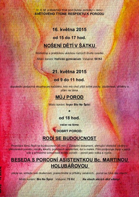 Mateřský klub Pod Duhou Hořice a Hnutí za aktivní mateřství Vás pořádají u příležitosti Světového týdne respektu k porodu setkání na téma "Dobrý porod".